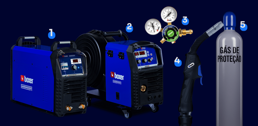 1- Fonte/máquina de solda MIG/MAG (HARDMIG 550 na foto) / 2- Alimentador de arame / 3- Regulador de gás / 4- Tocha de solda MIG/MAG / 5- Cilindro de gás de proteção