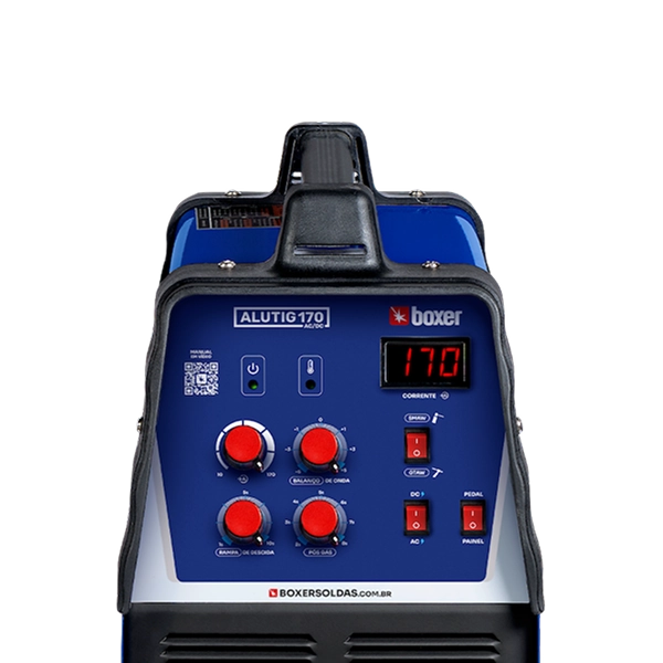 É indicada para soldar em uma corrente de solda de 124 Amperes SEM PARAR, devido ao seu ciclo de trabalho eficiente, alcançando até 170 Amperes. Possui saída de Corrente Contínua (CC/DC) e saída de Corrente Alternada (CA/AC), além de ser um equipamento de Corrente Constante, onde o soldador pode ajustar a Corrente de solda (Amperes) através do potenciômetro. Possui recursos programados manualmente através do potenciômetro para o processo TIG. Seleção do processo MMA ou TIG. Display Digital com as unidades de Corrente Nominal (A). LED de temperatura, que irá acender caso tenha uma frequente instabilidade de rede, ou por exceder o ciclo de trabalho. Ajusta de pós-gás, rampa de descida, corrente nominal, e caso habilitado o uso da corrente alternada, conseguimos ajustar o balanço de onda da corrente alternada. Por possuir Corrente Alternada, solda materiais não-ferrosos, como o Alumínio e suas ligas e possui também Corrente Contínua, onde solda materiais ferrosos como o Aço Carbono e Aço Inox. A Abertura de Arco no processo TIG é por Alta Frequência (HF) o que facilita o manuseio da tocha, menos depreciação do seu gás inerte e menor índice de contaminação do eletrodo de tungstênio e metal base. Solda Eletrodos Revestidos E-6013, E-7018, Inox, Ferro Fundido.