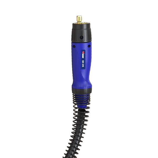 A BX 26 mantém a tradição de nossas tochas anteriores com um bocal de encaixe cuidadosamente projetado, facilitando a substituição de consumíveis e otimizando o tempo de trabalho. Além disso, oferecemos uma gama completa de opções de tamanho, permitindo que você escolha entre 2, 3 e 5 metros, adaptando-se perfeitamente às suas necessidades em diferentes ambientes de trabalho.